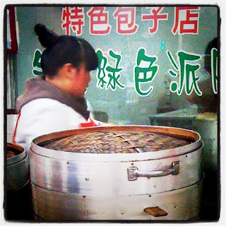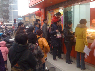 One of my true cultural experiences this year has been my weekly or biweekly visit to the local market and shops in my neighborhood. My local cai shi chang or market is located underground on the corner of the streets Fujian Lu and Tielubiejie. Upstairs and outside on the corner, life is a buzzing and bustling. Different kinds of activity and traffic make up a hierarchy in this intersection. A homeless couple sits silently and shamefully on the ground staring down at the sidewalk and refusing to look up as they hold up a tin cup in which passers-by may throw a few jiao or small amounts of paper money. Typically an older couple, one maybe blind, performs sad mournful music on the erhu, a traditional two-string Chinese violin. Pedestrians saunter by and carry little children with split pants or pampered and dressed up poodle dogs. Small crowds of people wait in line on the sidewalk to buy Portuguese egg tarts, steamed boa zi (steamed buns filled with meat or vegetables or sweet bean paste) or KFC style fried chicken. Bicyclists weave their way through the obstacle course of pulled up cars and loitering pedestrians without being knocked over by the stealthy, quiet and sneaking-up electric motorbikes. The mopeds and electric motorbikes, usually carrying at least two people or a heavy load of timber or twenty heavy boxes that are precariously strapped onto the vehicle, have a special status in the intersection as they only stop briefly for drop-offs or pick-ups or may not even stop at all. Mopeds and motorbikes don’t have to actually stop at red traffic lights and the drivers are extremely skilled at keeping one hand on the horn of their bike while the other hand takes control of steering the vehicle ahead into the middle of the intersection while also maneuvering it around pedestrians and larger vehicles coming from all different directions. Taxis stop and go through the intersection as well, although don’t count on ever getting a cab during the time you need one most. The drivers will likely be switching shifts for a 2 hour time block from around 5:30 to 7:30 pm (or whenever they feel like it). The corner of Fujian Lu and Tielubiejie, like many similar streets in this affluent part of China, has an increasing number of private cars dotting the street, most of which are fairly new and pricey. Black Buicks (which somehow have sold quite well here and some wealthy Chinese might mistake them for German luxury cars), VW Passats, Audis and BMWs with tinted windows outnumber the small Chinese hatchback QQ cars with Hello Kitty or Snoopy stickers on them. Mian bao che– translated literally to “bread vehicles” because of their shape’s resemblance to a loaf of bread, also fit into this hierarchy. These vehicles typically are pretty banged up but are practical, especially for the vendors in the market who may load up remaining goods and boxes at the end of the day into the back end of the little vans. At the top of the hierarchy of the intersection are public and private buses. The bus I take from my campus to the campus where I work crosses and turns into the intersection as well as various public buses that can be caught 100 meters from the intersection. Within a moment, one can hop off the bus and be thrown back into the chaos and hubbub of the world below on the street and be back almost on the bottom of the hierarchy.